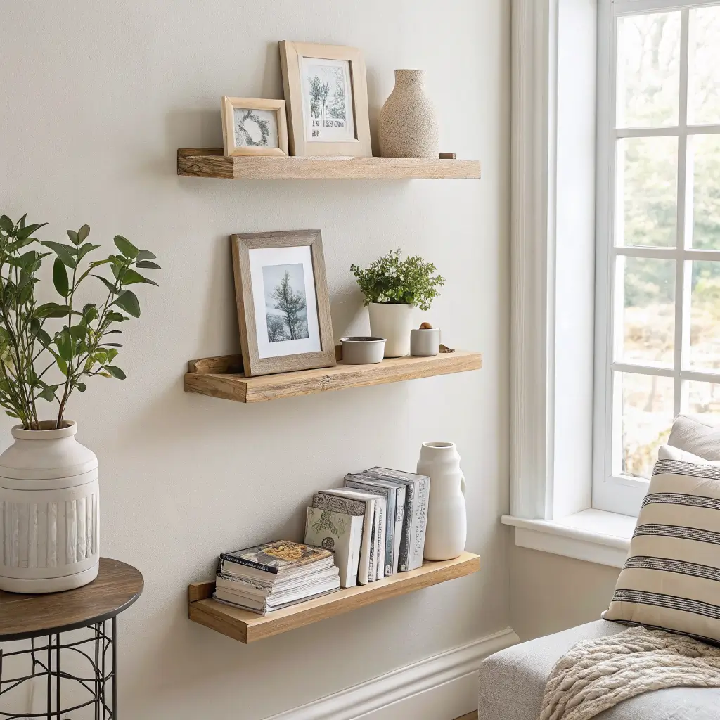 Here’s why I’m obsessed with mini floating shelf galleries: they give you the flexibility to constantly switch things up without putting new holes in your wall. I installed three of these bad boys in my entryway—staggered at different heights—and they’ve become my favorite spot to rotate seasonal decor, small plants, and those random pretty things you collect but never know where to put.