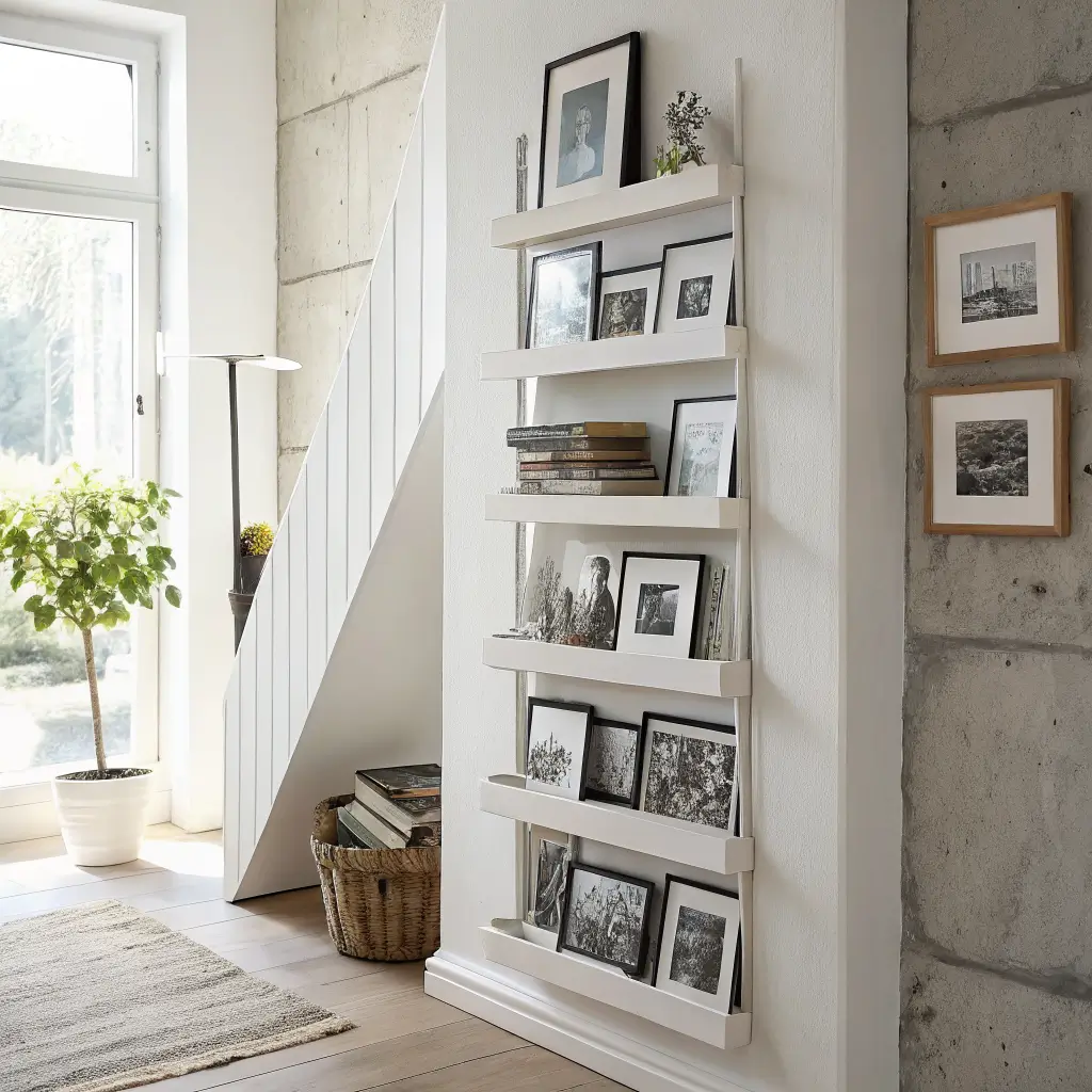 I’ve got four ledges running down a narrow wall in my hallway—the kind of space that’s basically useless for anything else. Each ledge is only about 3 inches deep, so they don’t jut out into the walkway, but collectively they make a massive statement. I mix framed photos with small plants, a vintage book or two, and sometimes random objects that make me happy.