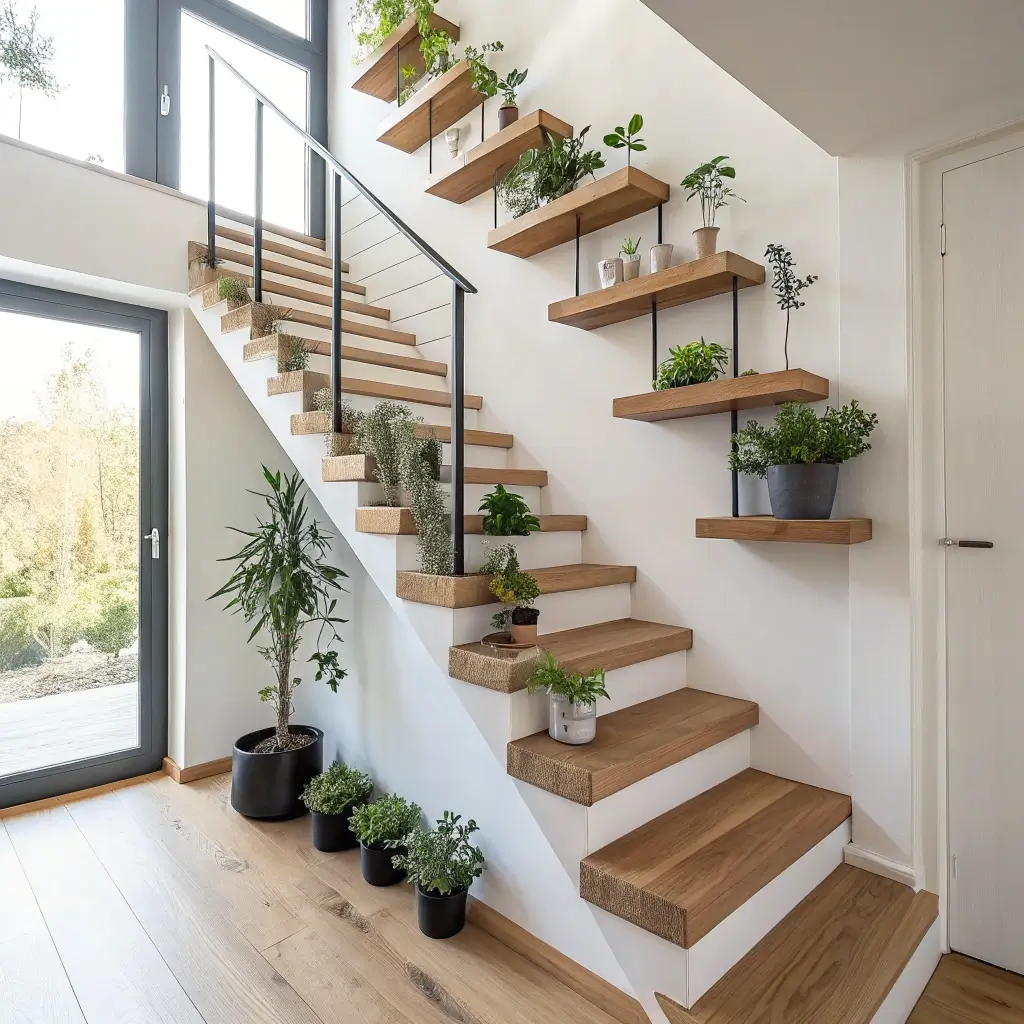 If you want your staircase wall to feel alive โ literally โ floating shelves with plants might be your perfect match. This idea brings warmth, texture, and a little bit of nature into a space that often feels cold and transitional.