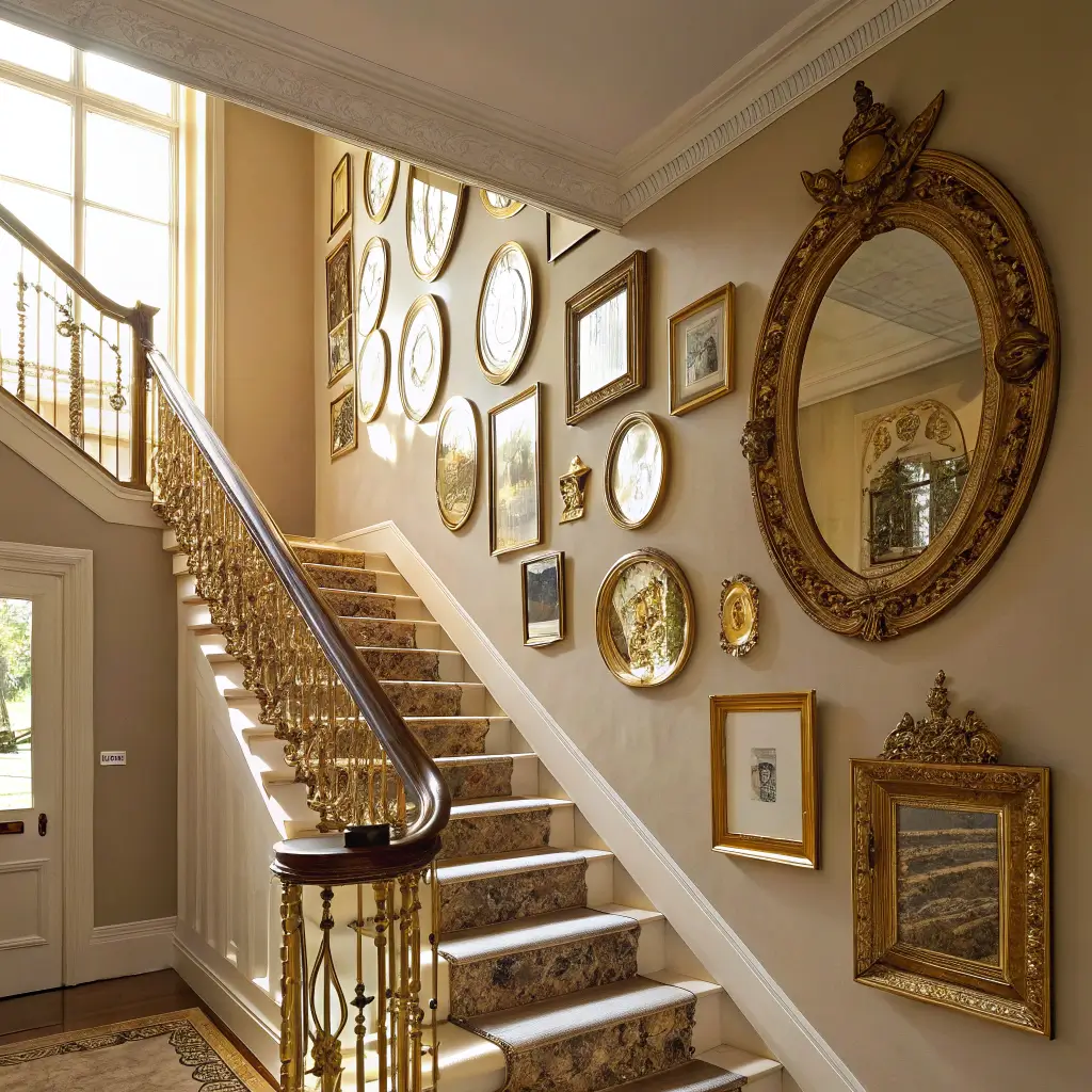 Okay, this one’s a personal favorite. A collection of vintage mirrors on a staircase wall does something magical โ it reflects light, makes narrow stairwells feel larger, and adds a layer of old-world charm that’s hard to replicate with anything else.