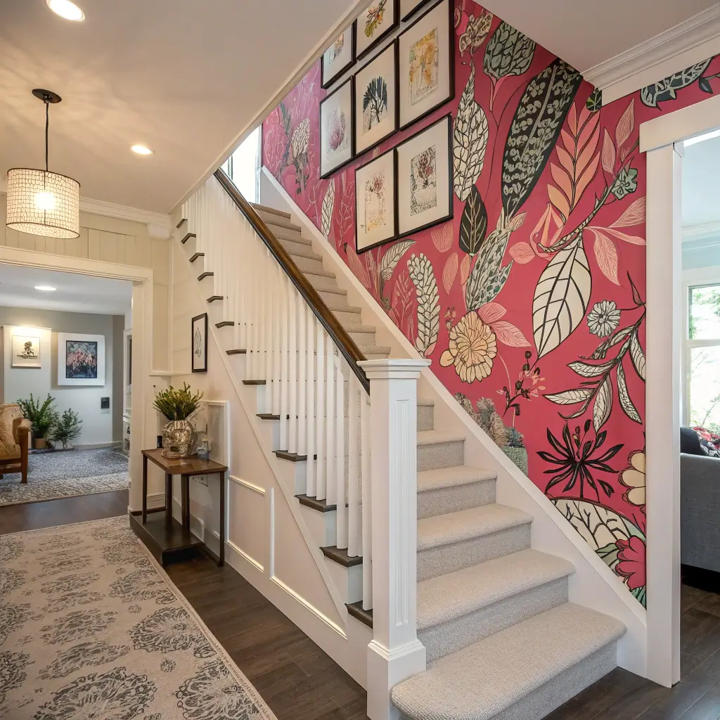 Pro tip: Wallpaper just the staircase wall, not the entire stairwell. This creates a focused accent that draws the eye without overwhelming the space.