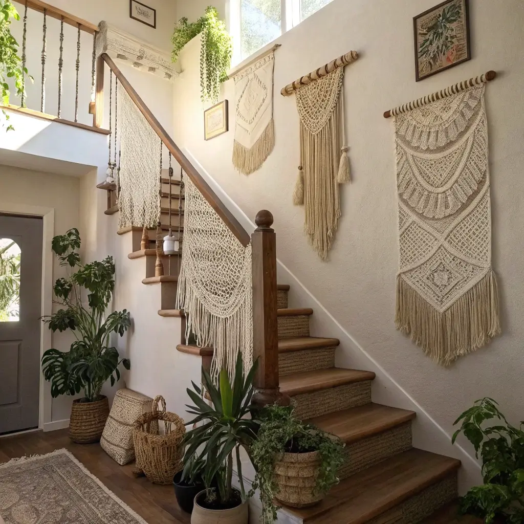 For a softer, more bohemian approach to staircase wall decor, hanging macramรฉ pieces and woven tapestries bring texture, movement, and a handcrafted warmth that hard-edged art simply can’t replicate.