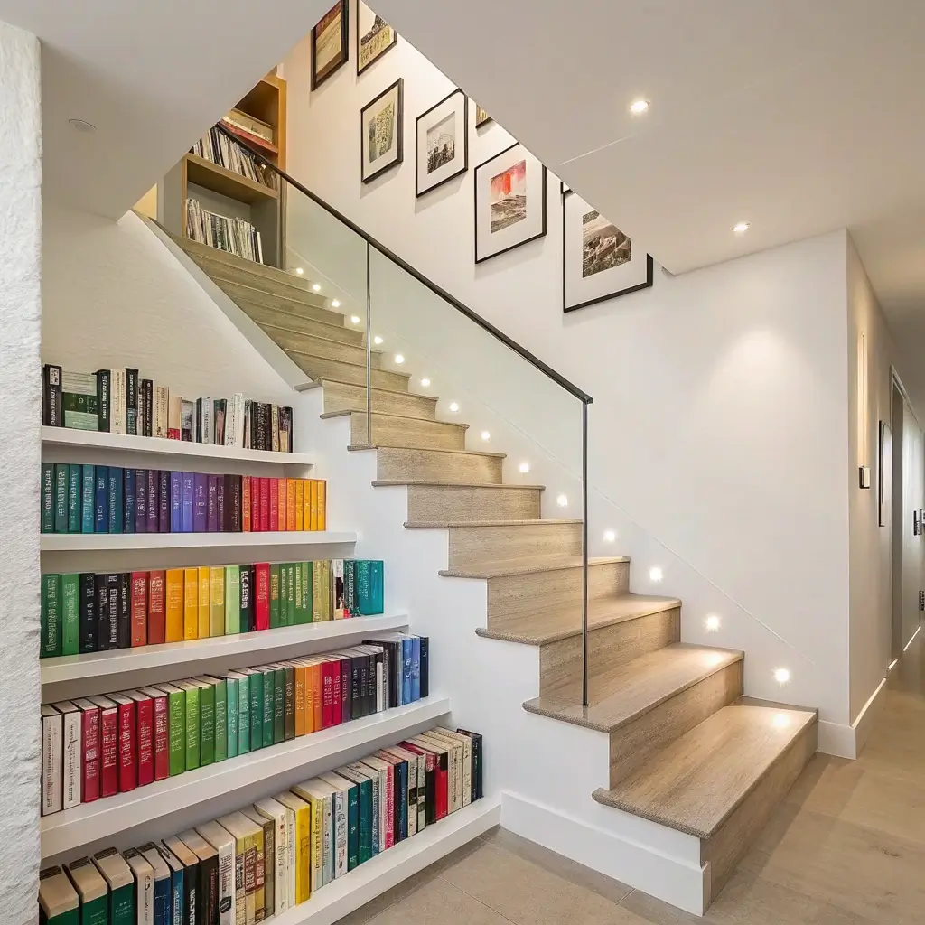 Bookworms, this one’s for you. A floating book display on your staircase wall turns your literary collection into functional art. Invisible floating bookshelves (the kind where books appear to hover against the wall) create an effect that’s equal parts whimsical, intellectual, and genuinely cool.