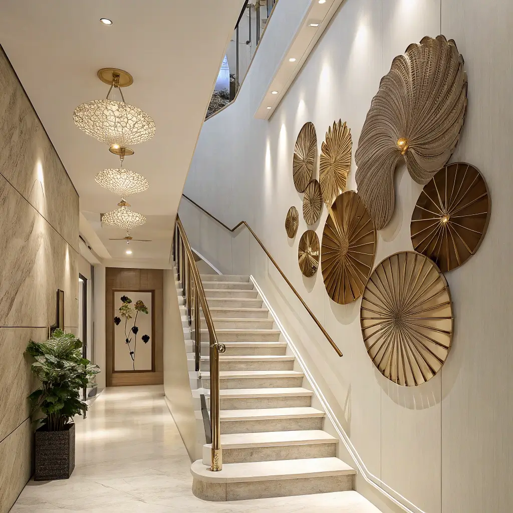 - Oversized single-piece installationsย โ One large, dramatic metal sculpture can anchor an entire staircase wall without needing a single companion piece.