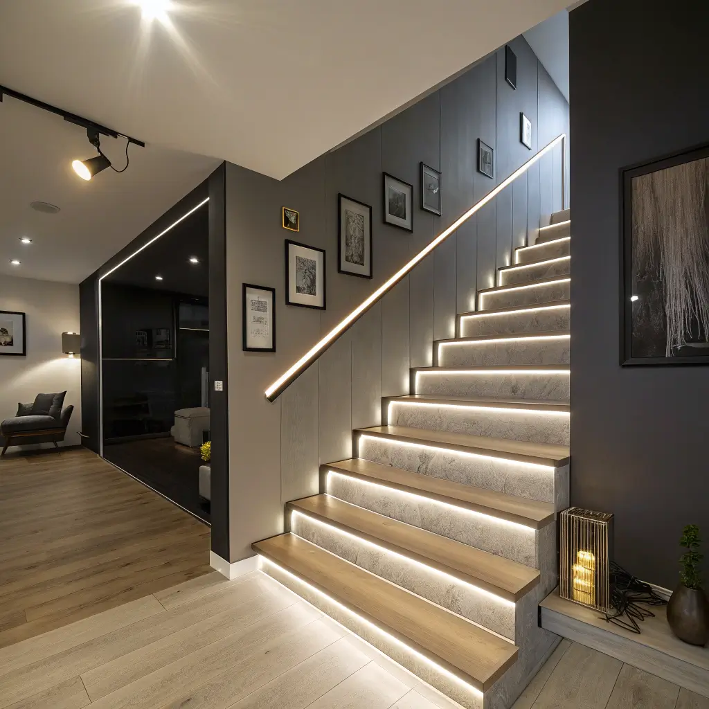 Sure, LED strips look amazing. But they also serve a practical purpose. Staircases can be dangerous in low light, especially at night. Strategically placed LED strips along the wall (or tucked under a handrail or behind floating shelves) provide soft, ambient illumination that makes nighttime trips to the kitchen far less treacherous.