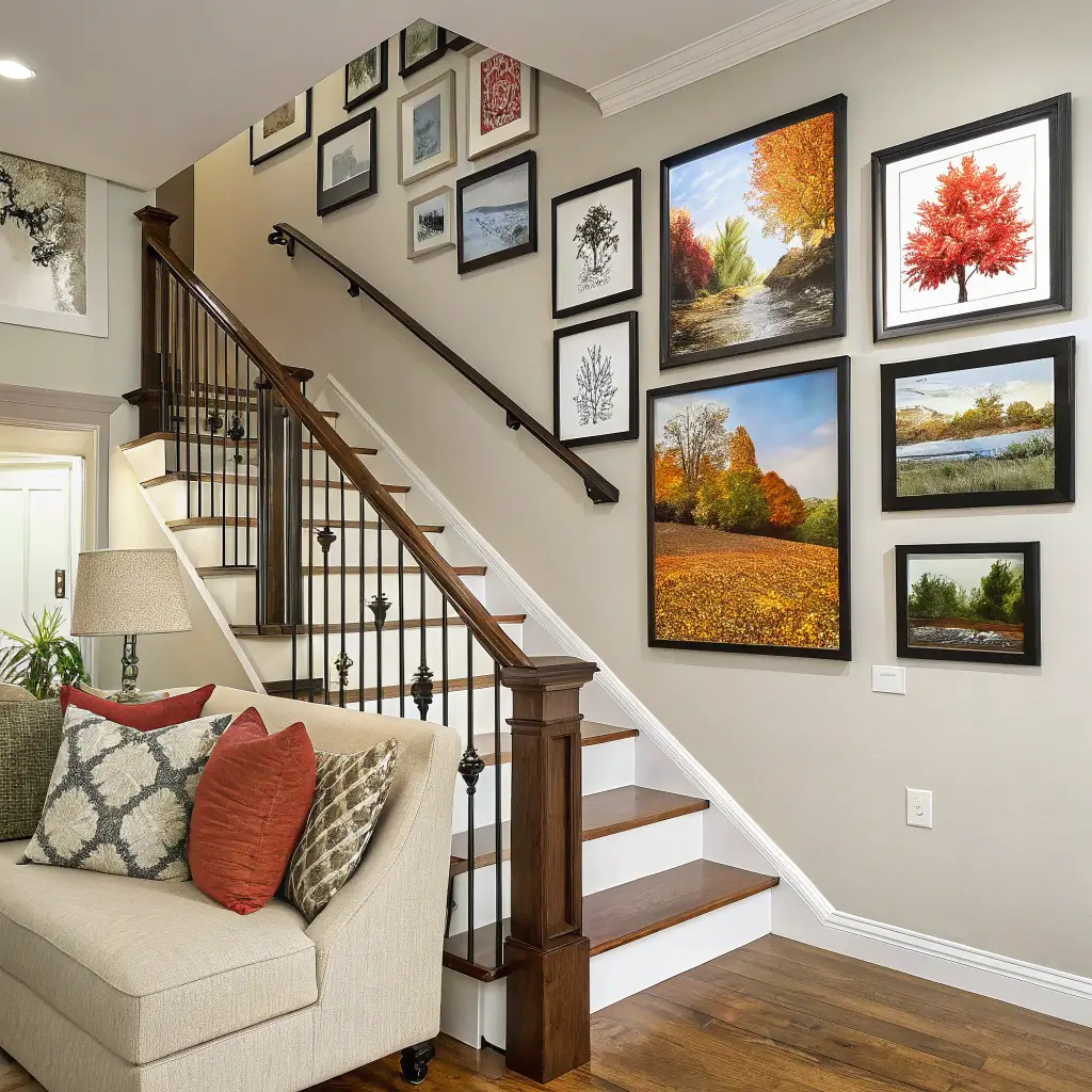 Let’s start with the reigning champion of staircase wall decor โ the gallery wall. And before you roll your eyes and say, “Everyone does that,” hear me out. Everyone does it because it works. There’s a reason this approach has stuck around for decades, and it’s not because people lack imagination.