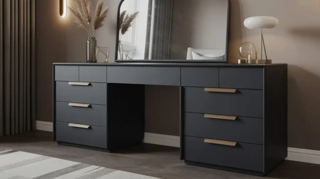 Ever wondered why matte black everything suddenly became the design world’s obsession? Because it works, that’s why. A matte black minimalist vanity brings this sophisticated, almost mysterious edge to your bedroom that glossy finishes just can’t match. It doesn’t scream for attention – it commands it quietly.
