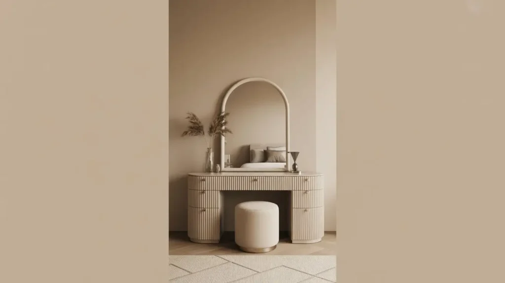 The curved edges aren’t just aesthetically pleasing; they’re practical too. No more bruised hips when you’re rushing around your bedroom in the morning. The rounded edges create a more fluid flow throughout your space, and they photograph beautifully from any angle. Sculptural shapes in furniture are having a major moment right now, and curved vanities are leading that charge.