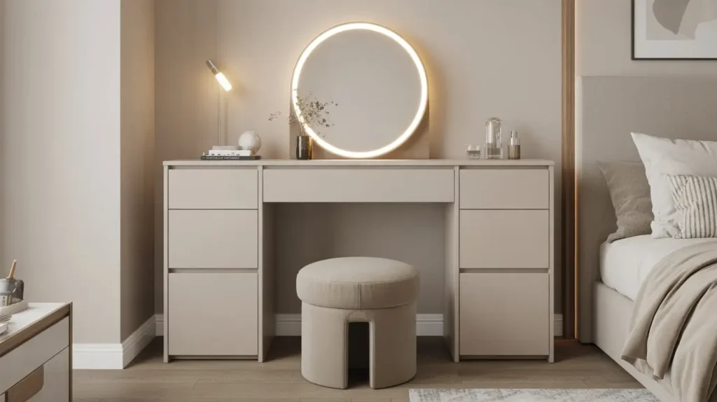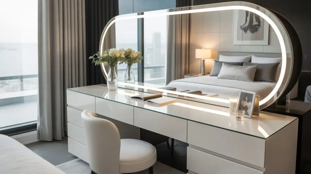You know that feeling when you check into a nice hotel and the bathroom vanity has those perfect lights around the mirror? We’re bringing that energy to your bedroom. Hotel-style vanities nail the balance between luxury and functionality – they’re designed for actually using, not just looking at.