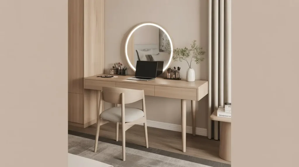 These pieces typically feature a larger surface area with storage that works for both makeup and work supplies. During the day, it’s your workspace—laptop, notebooks, coffee cup claiming territory. At night or in the morning, it transforms into your beauty station with a quick clear-off and maybe a flip-up mirror.
