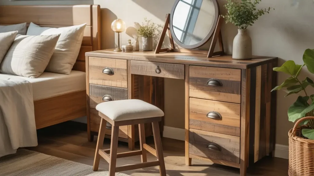 Here’s where things get fun and budget-friendly. A DIY upcycled vanity lets you create something completely unique while saving money and being environmentally conscious.