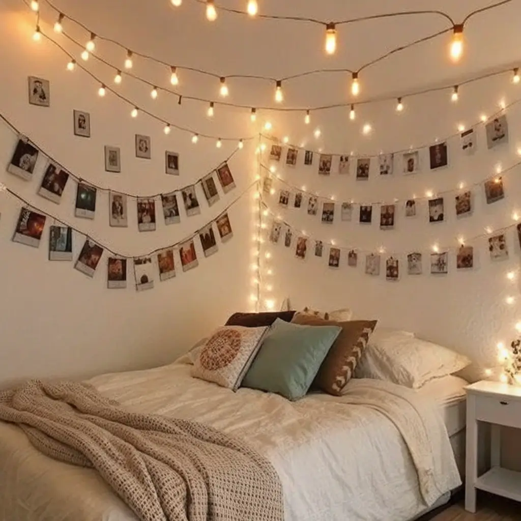 This idea combines two things everyone loves: mood lighting and memories. String lights with clips or clothespins create this dreamy photo display that’s basically Instagram in real life.