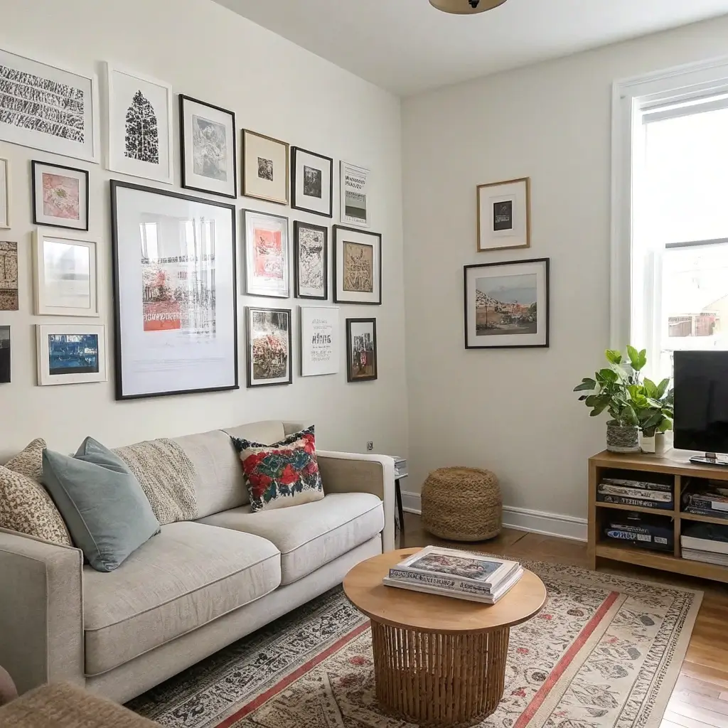 Working with a tiny living room? Focus on vertical arrangements that draw the eye up. I learned this the hard way after making my small living room look even smaller with art hung at eye level. Now I cluster pieces higher on the wall, and boom – instant ceiling height illusion.