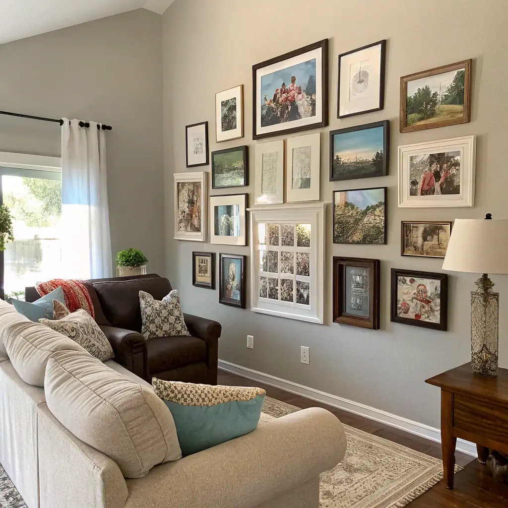 My current gallery wall combines black and white photos, two small mirrors, and a vintage clock. The variety keeps it interesting without looking chaotic.