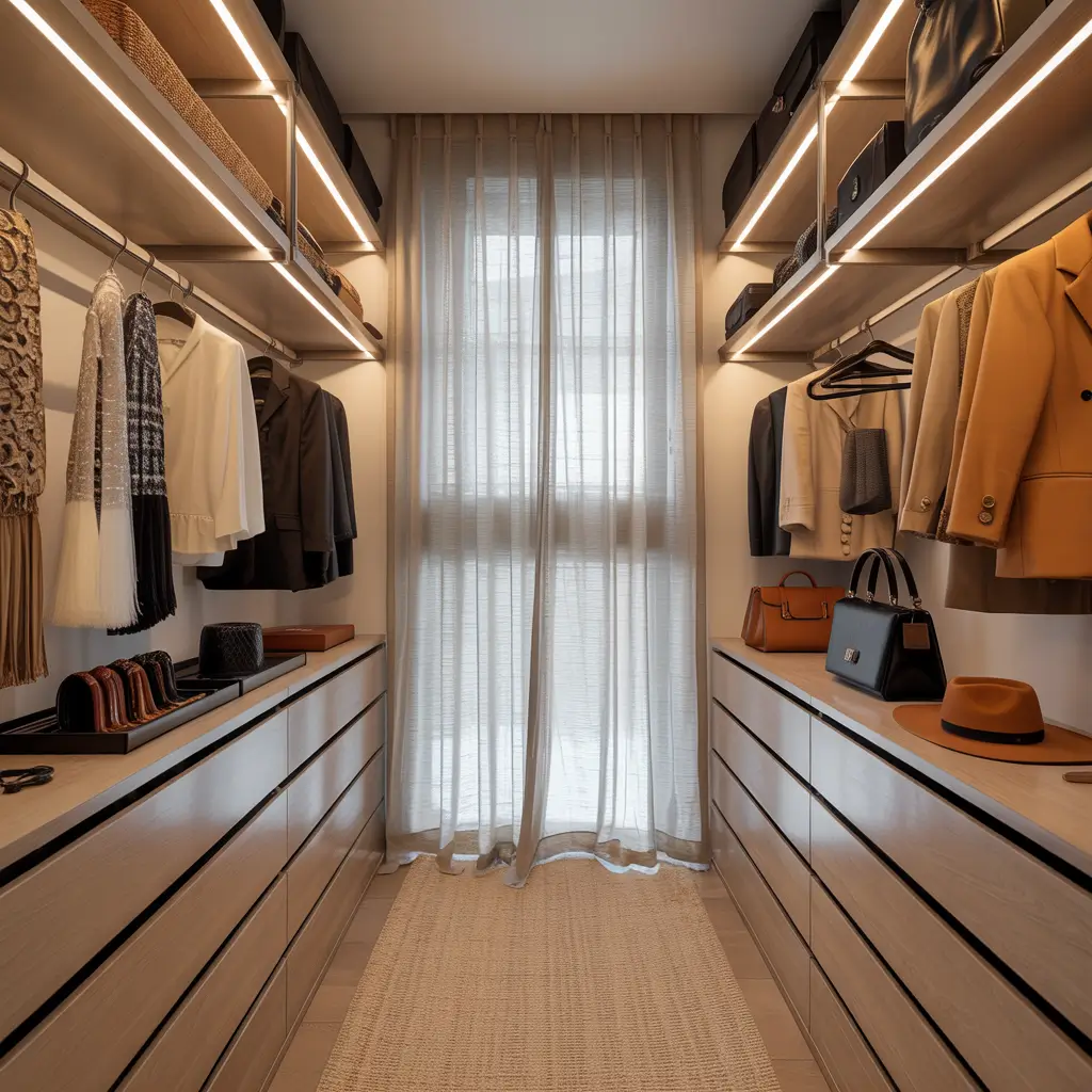 The key is smart layout planning. Think about hanging space on both sides, shelving at eye level, drawers for accessories, and maybe a small bench or ottoman in the center. Add some good lighting, and boom—you’ve created your personal styling sanctuary.