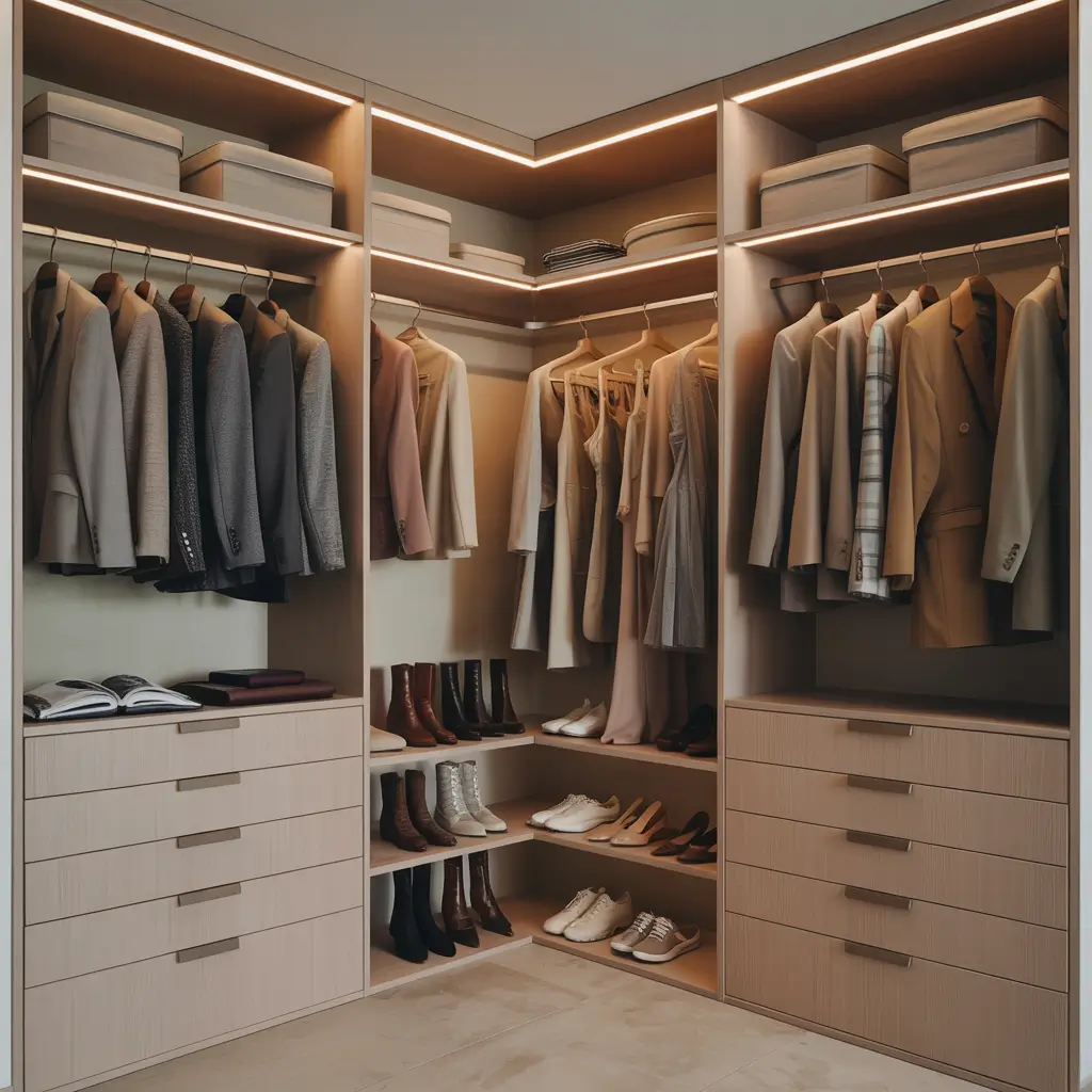 The trick is working with the corner’s natural shape rather than fighting against it. Curved hanging rods, lazy Susan turntables, and triangular shelving maximize accessibility while fitting perfectly into angular spaces.
