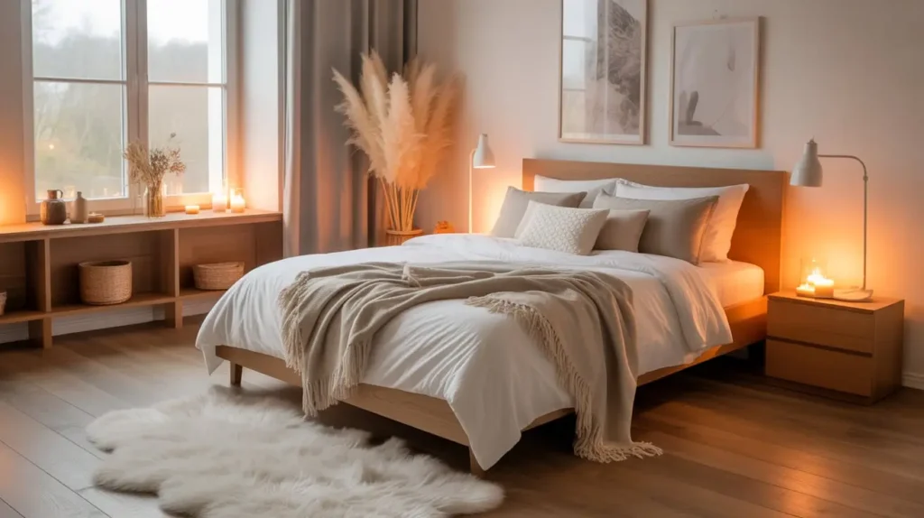 A hygge bedroom focuses on comfort, soft lighting, and that snuggled-up feeling. I basically turned my bedroom into a cocoon using this approach. Lots of candles (I’m talking at least a dozen scattered around), super soft bedding that feels like sleeping on a cloud, and warm wood tones everywhere.