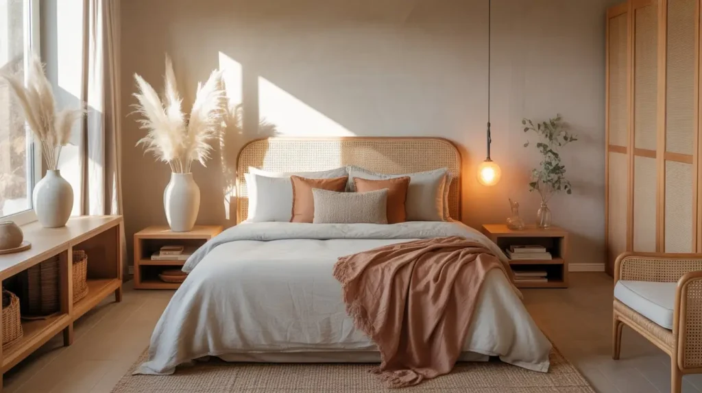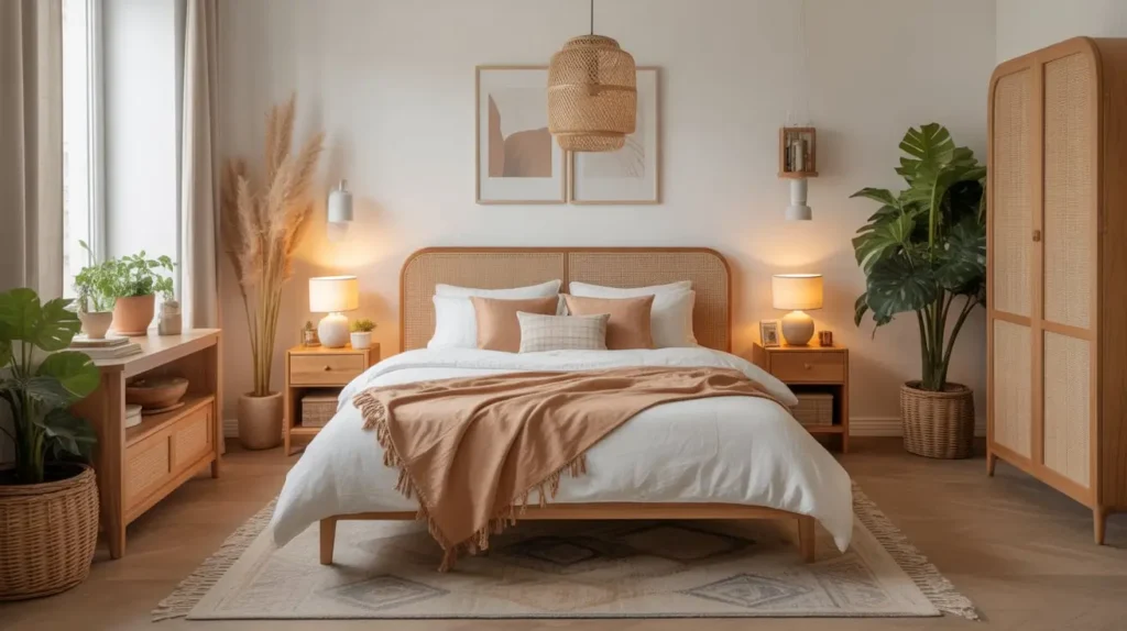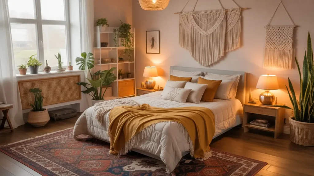Macramé wall hangings add texture without taking up floor space (crucial in smaller bedrooms). I hung one above my bed, and it instantly softened the space. Rattan furniture, woven pendant lights, and plenty of floor cushions complete the vibe.