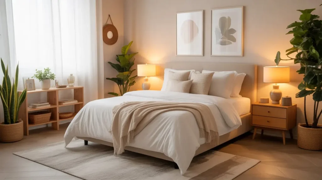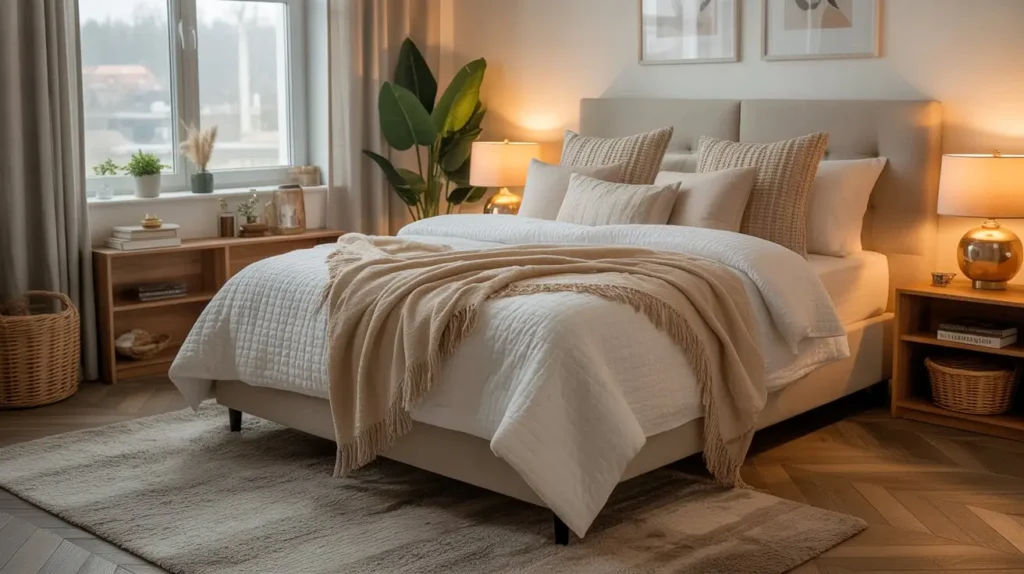 Keep your color palette simple but warm—maybe just three main colors. I use warm oak wood tones, soft cream, and a muted terracotta. That’s it. But within those colors, I play with textures like crazy. Smooth linen bedding, a chunky knit throw, a soft wool rug—see where I’m going?