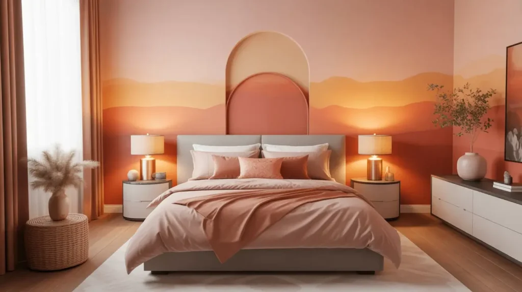 Think about those colors you see when the sun’s going down: peachy pinks, warm oranges, golden yellows, and those deeper purple-reds on the horizon. I created an ombré effect on one wall using sunset colors, and honestly, it’s become my favorite feature in my entire home.
