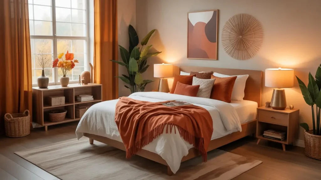 Think about what makes autumn feel warm and cozy: rich oranges, deep reds, golden yellows, and warm browns. I decorated my bedroom with this palette, and even in summer, it feels welcoming rather than seasonally confused.