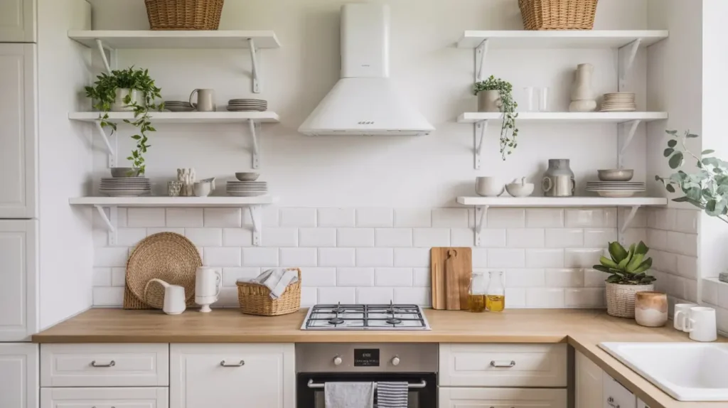 12. White Kitchen with Open Shelving Look