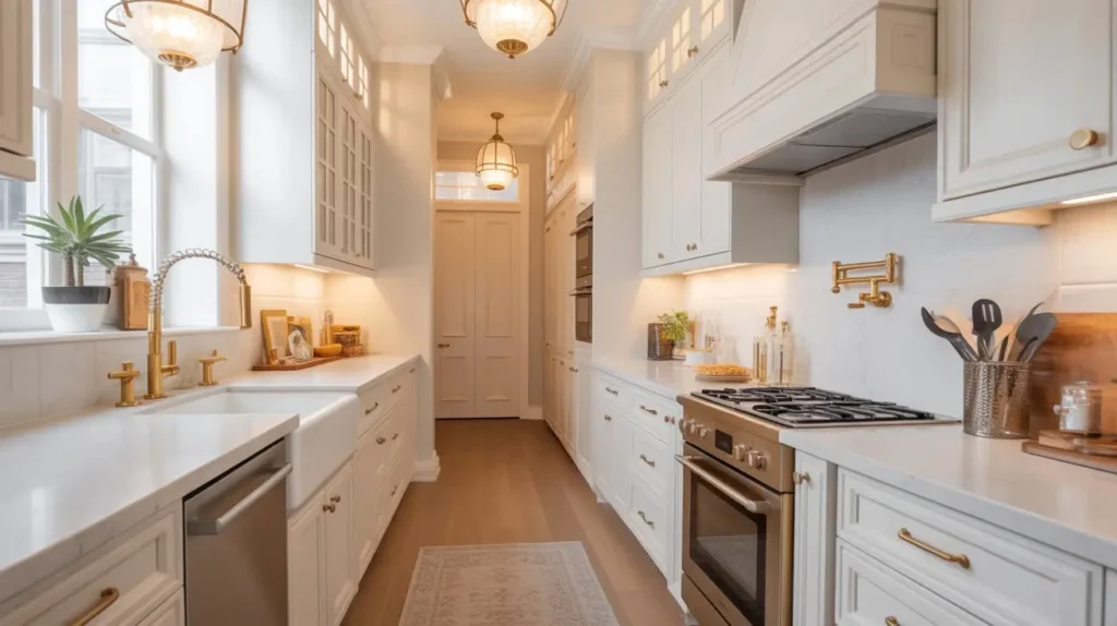 FYI, if you want your white kitchen to feel glamorous AND warm, gold accents are your answer. I’m not talking over-the-top bling here—we’re aiming for subtle sophistication that catches the light beautifully.