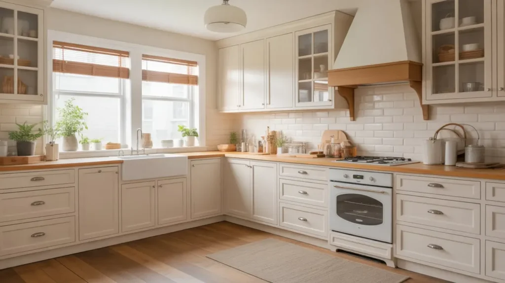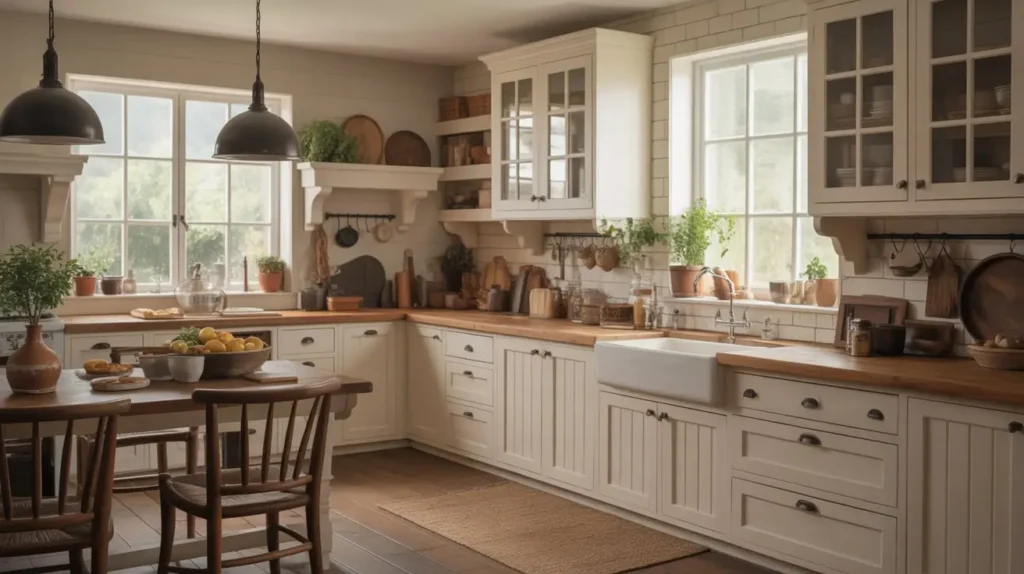 We’re talking Shaker-style or beadboard cabinets in soft white or cream, paired with rustic elements that prevent the space from feeling too polished. I’ve got a serious soft spot for this style—it’s comfortable without being sloppy, and it makes even the smallest kitchen feel welcoming.