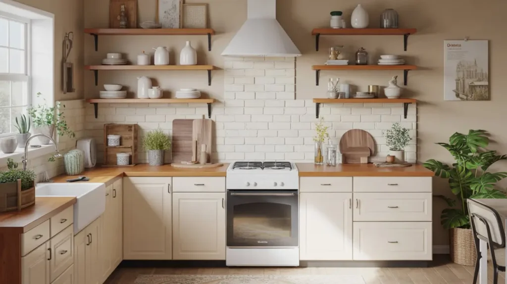 Style your open shelves thoughtfully. Mix heights, add some greenery, include things you actually use rather than just decorative objects. Nothing screams “trying too hard” like open shelving that’s clearly styled for Instagram rather than function.