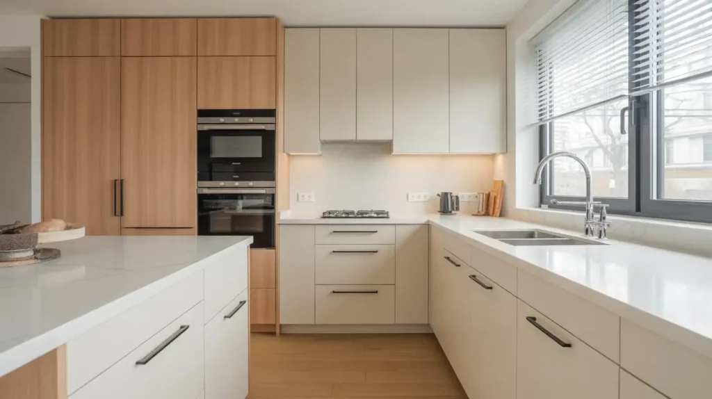 - Matte finishes: On cabinets, walls, and countertops—no high-gloss anything