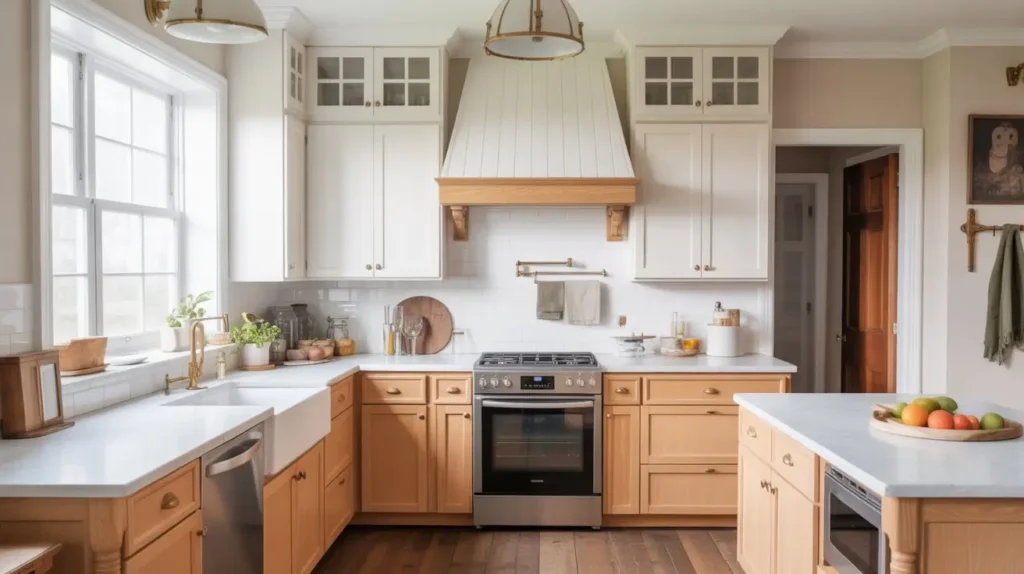 Real farmhouse style (not the mass-produced version you see in every suburb) combines functionality with warmth. I visited a renovated 1920s farmhouse last fall, and the owner installed white oak shaker-style cabinets that looked like they’d always been there. She mixed original architectural details with new cabinetry so seamlessly that I couldn’t tell what was historic and what was installed last month.