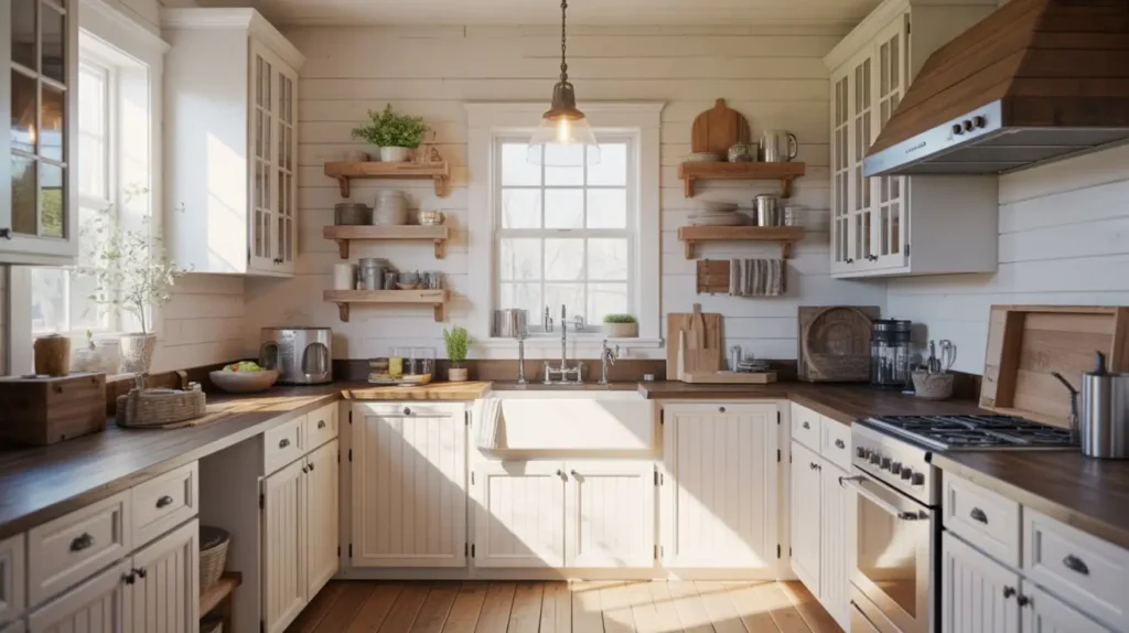 - Open shelving on at least one wall: Breaks up the cabinet mass and adds breathing room