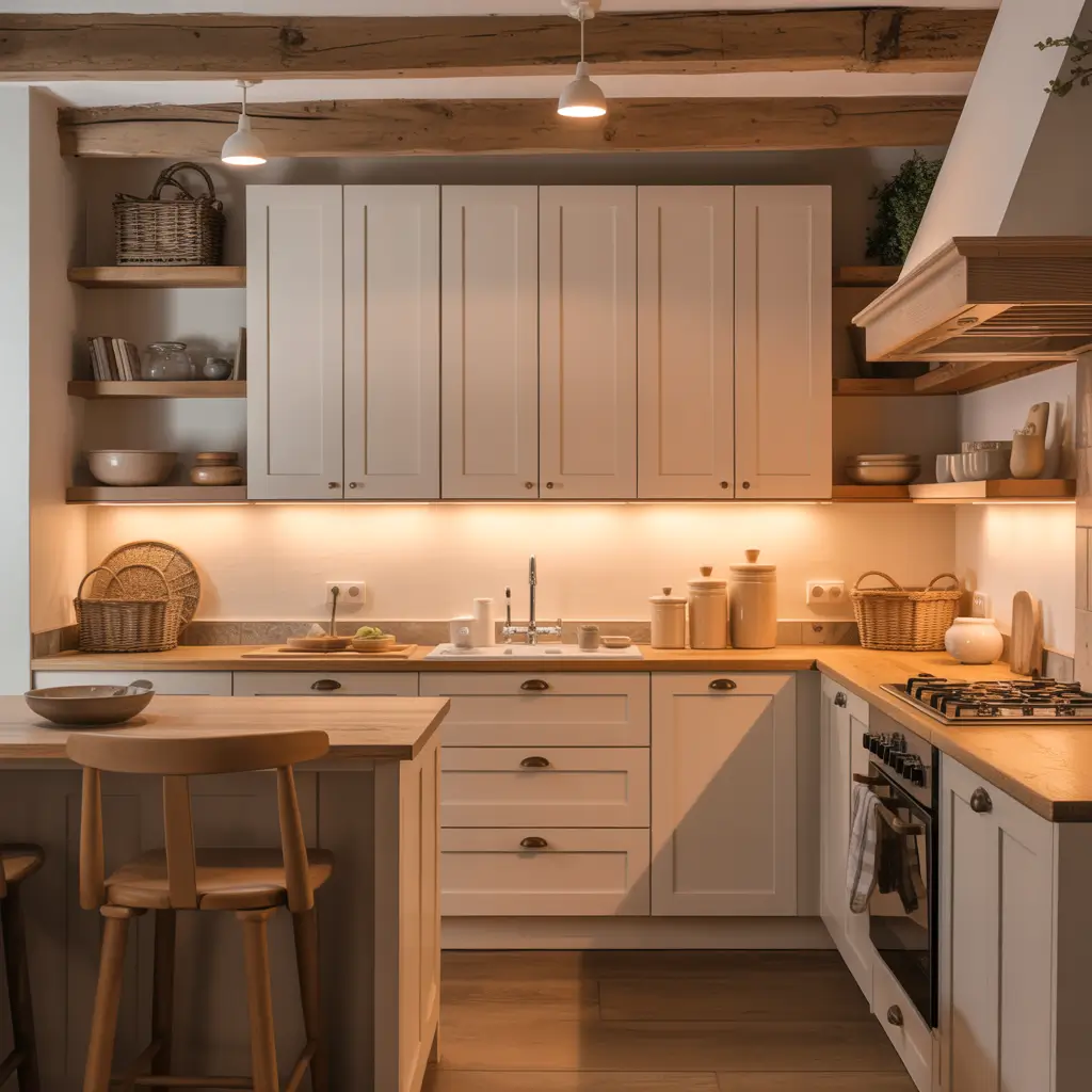 Warm White Shaker Cabinets with Natural Wood Accents