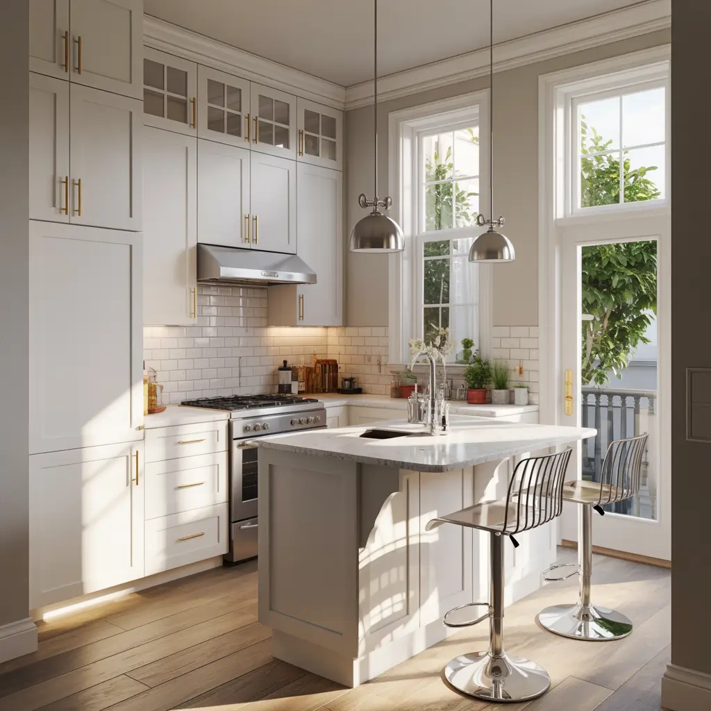 Here’s what I learned from my tiny kitchen days: go vertical. Floor-to-ceiling white shaker cabinets draw the eye upward and maximize storage. You’d be surprised how much stuff you can pack into upper cabinets that extend all the way to the ceiling.
