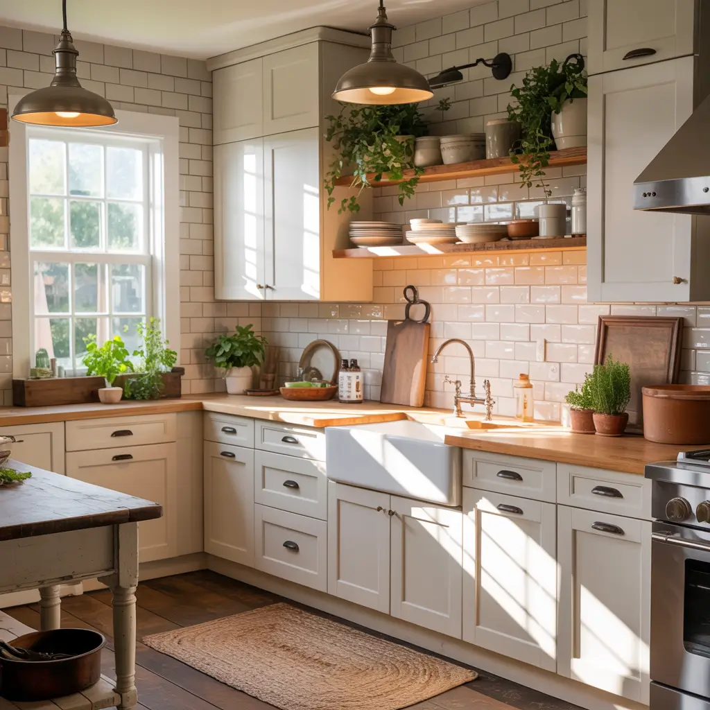 Nothing says farmhouse quite like white shaker cabinets paired with open shelving. This look has been trending for years, and I get why—it’s approachable, functional, and Instagram-worthy.