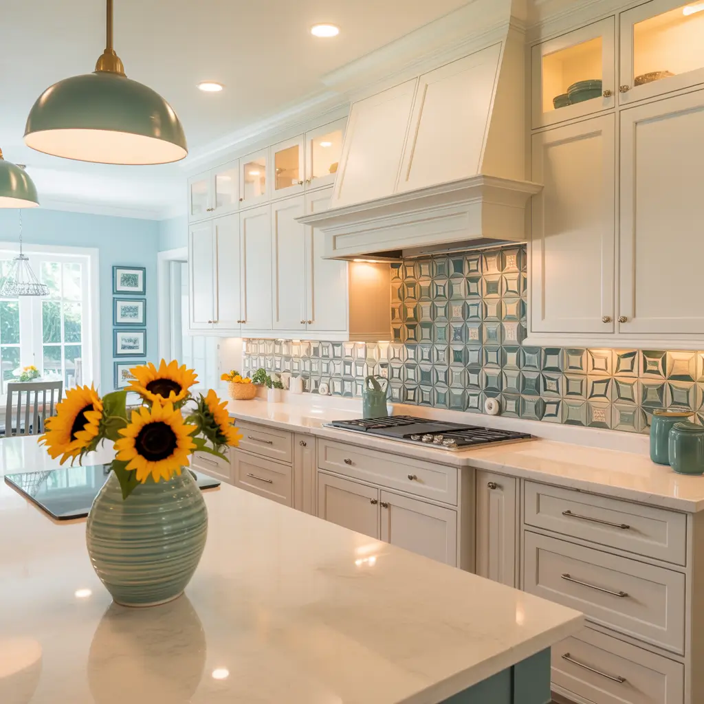 • Blue accents: Navy, aqua, or soft powder blue in backsplashes or islands