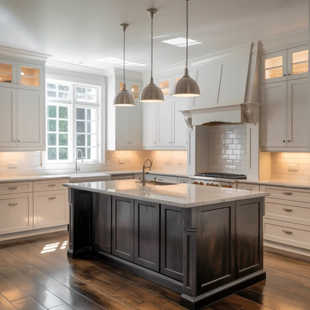 This is my personal favorite look, hands down. White perimeter cabinets with a dark contrasting island creates a focal point that anchors your entire kitchen. The island becomes furniture rather than just more cabinetry.