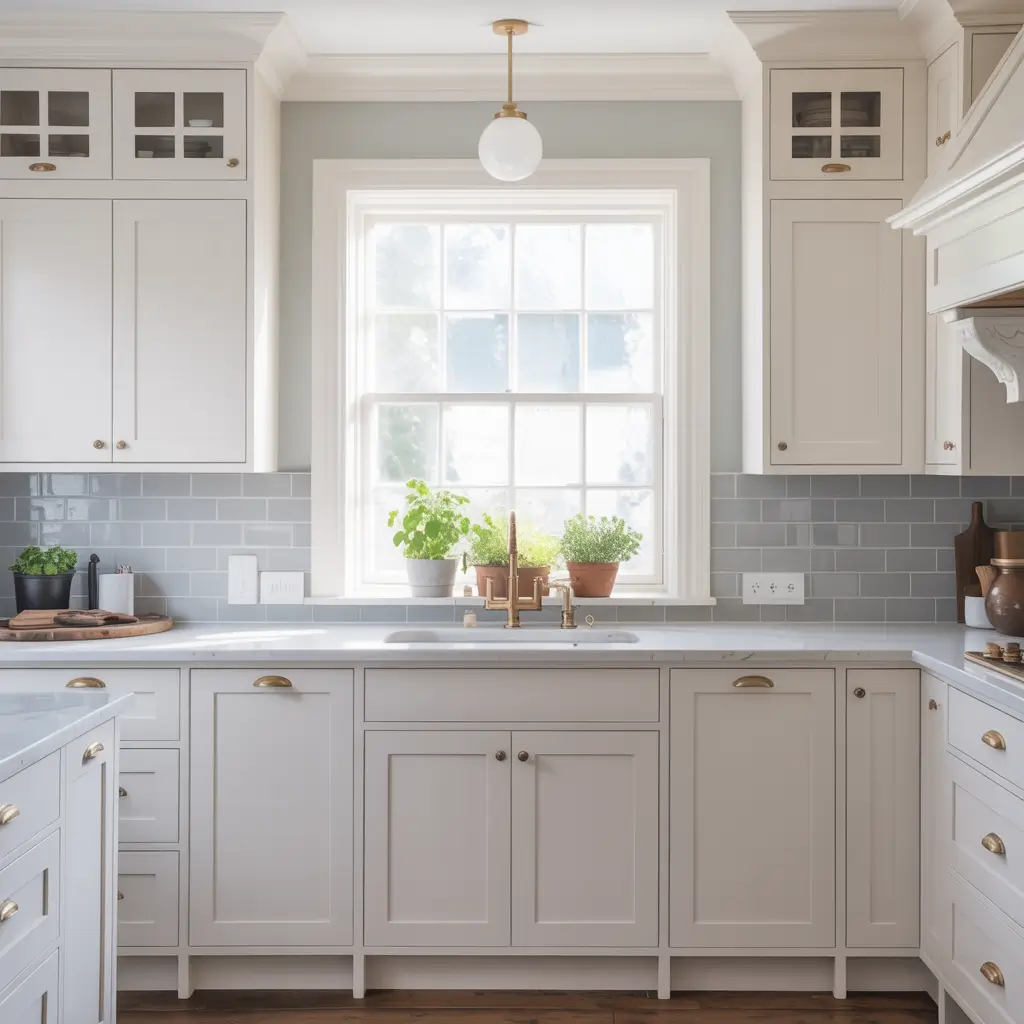 • Neutral palette: White cabinets with grey, greige, or soft blue accents
